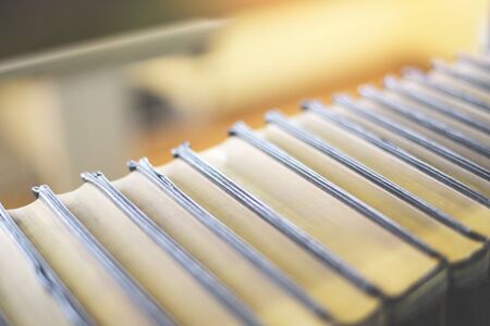 New car air filter isolated on yellow background . Close up. Top view.