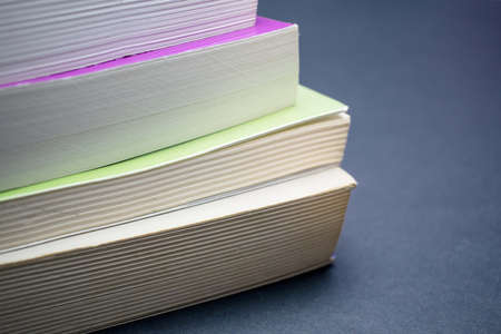 Books with soft cover. paperback close up. book edge macro. pages pulled together with an elastic band