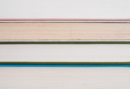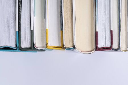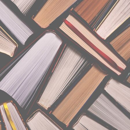 Books next to each other top view. Background from multicolored old books.