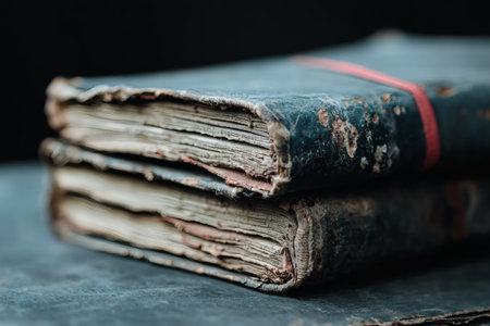 A pair of vintage leather-bound journals sits quietly on a dark wooden table. The weathered covers, adorned with a touch of red ribbon, tell tales of history and memories, inviting curiosity about their forgotten stories.
