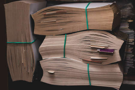 Accounting and taxes. Large pile of magazine, notebook and books closeup