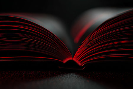 A mysterious scene of a book's pages glowing crimson in a dim environment, evoking intrigue and inviting reflection under subtle lighting.