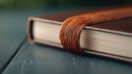 A close-up image of an elegant journal with a brown cover and textured binding, resting on a wooden surface. Perfect for inspiration or gifts.