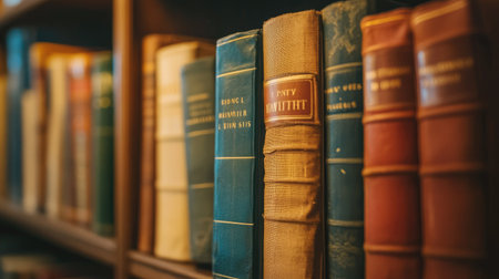 A close-up of a classic hardback book with gold lettering on the spine, sitting on a library shelf among other vintage books.