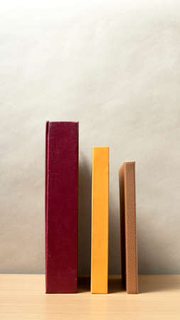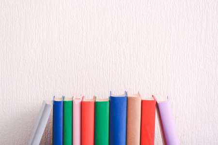 Different books on white table near light gray wall. Space for text