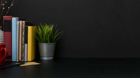 Close up view of dark modern workplace with copy space, stationery, books and decorations on black desk with dark wall background