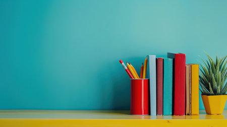A vibrant collection of books in various colors sits on a yellow shelf in front of a teal wall. A red pencil holder with yellow pencils stands to the left, while a small potted succulent adds a touch of green to the scene.
