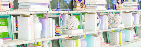 Row of multicolored hardback books and an old bookstand, reading education, literature, good copy space panoramic format