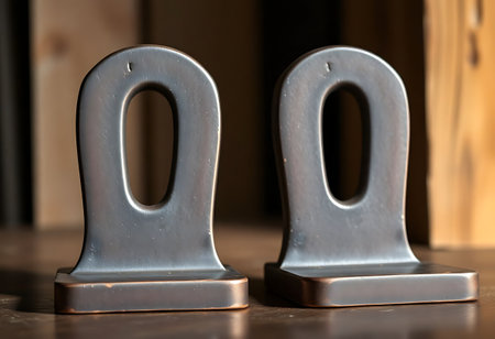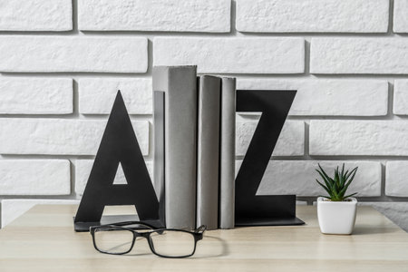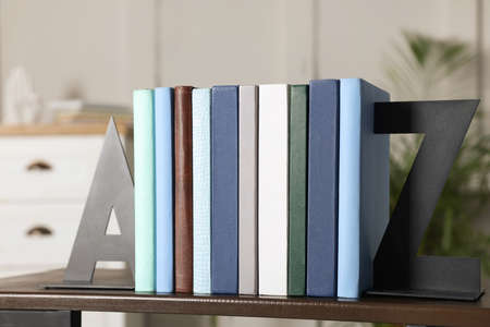 Minimalist letter bookends with books on shelf indoors