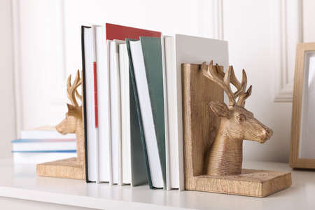 Wooden deer shaped bookends with books on table indoors