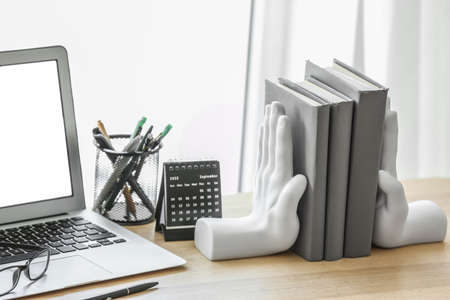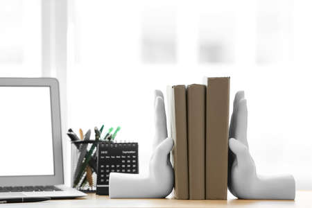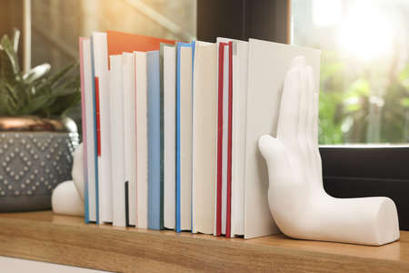 Hand shaped bookends with books on shelf indoors. Interior design