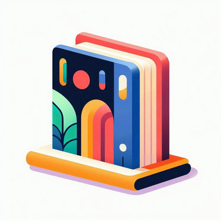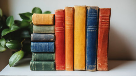 Six colorful books are neatly stacked on a light surface, with shades ranging from blue to red. A green plant adds a touch of nature to the cozy setting.