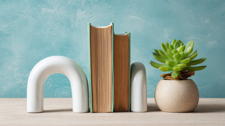 Elegant tabletop arrangement with book, decorative arch, and succulent plant against a soft blue textured background for stylish interior decor