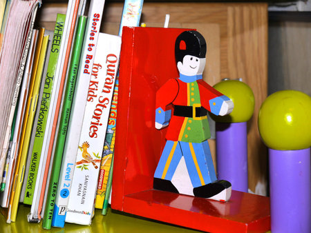 Bookends with books and pictures on shelf indoors