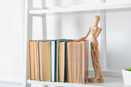 Shelf unit with books and mannequin near white wall in room