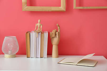 Modern lamp, wooden hand, puppet and books on white table near color wall
