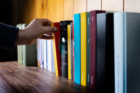 A close-up of a hand gently pulling a hardcover book from a row of colorful books on a wooden shelf.