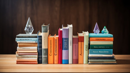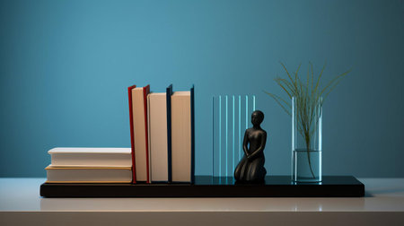 a minimalist table stands elegantly against a clean white background, its sleek wooden surface reflecting subtle hints of natural light, surrounded by a pair of matching bookends holding a stack of vintage books, evoking a sense of simplicity, organization, and literary charm in this serene still-life composition. ai generated