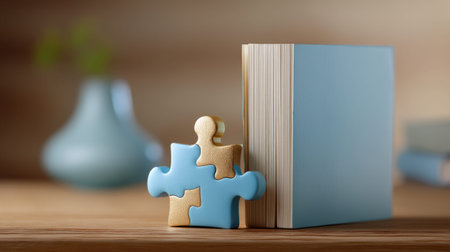 A charming blue puzzle piece rests beside a blank book on a wooden surface, creating a cozy and inviting atmosphere. This image evokes creativity and simplicity.