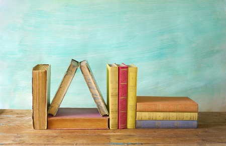 Bunch of vintage hardcover books on wooden background. Selective focus.