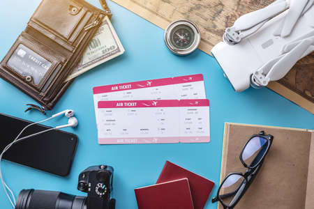 Necessary things for the flight on vacation. Plane tickets, passport, phone, credit card, drone quadcopter, camera on a blue background. The concept of easy preparation for travel. Top view