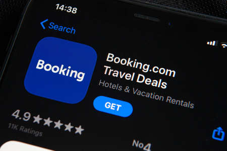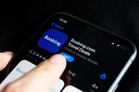 Hands holding iPhone 11 with app of booking.com service. Travel and hotel industry crisis due to Covid or Coronavirus pandemic, restructuring and layof.