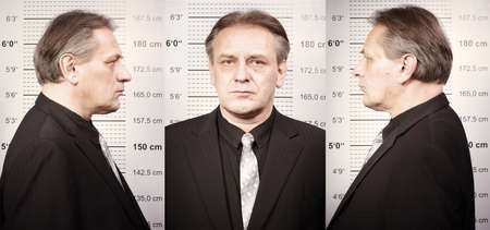 Mugshot of a criminal man portraits on a police station in front of a mug board