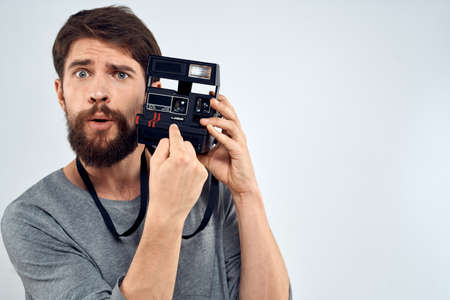 photographer with camera hobby technology studio lifestyle creative light background