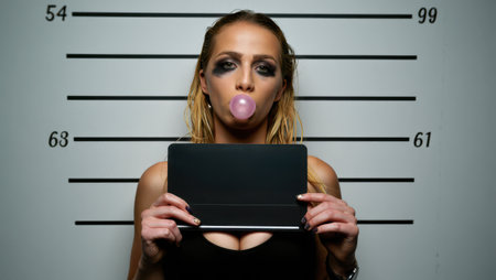 A young woman with dramatic makeup blows a bubble with gum while holding a sign in front of a height chart at a police station, showcasing a unique mugshot situation