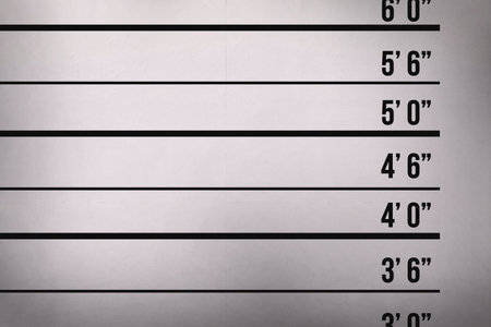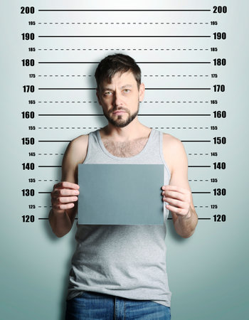 Criminal mugshot. Arrested man with blank card against height chart