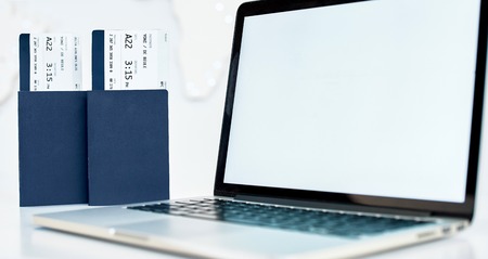 Air tickets, passports and credit card near laptop. Online ticket booking concept