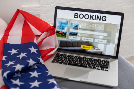 booking on the computer. laptop and american flag