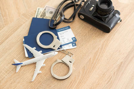 passport, tickets, toy plane, handcuffs for travel