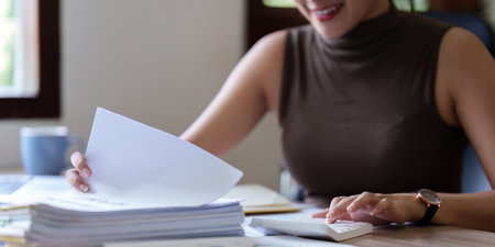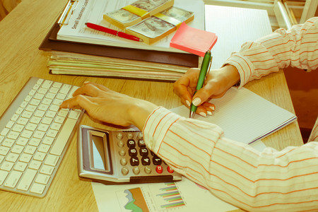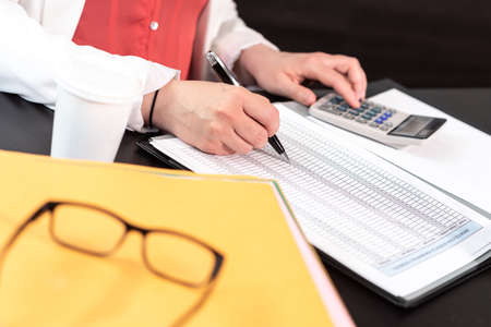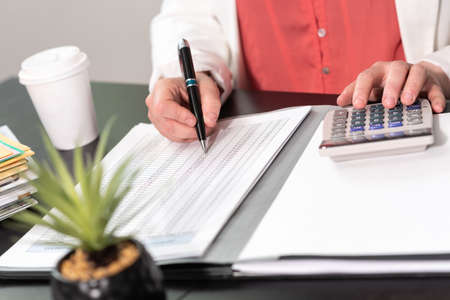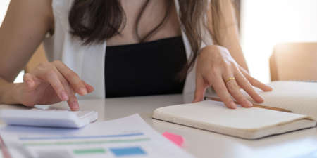 Close up Business woman hand using calculator to calculate the companys financial results and budget. Account Audit Concept