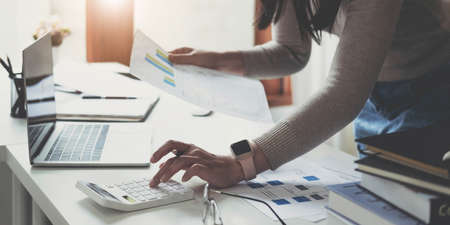 Business woman working in finance and accounting Analyze financial budget with calculator. work from home concept.