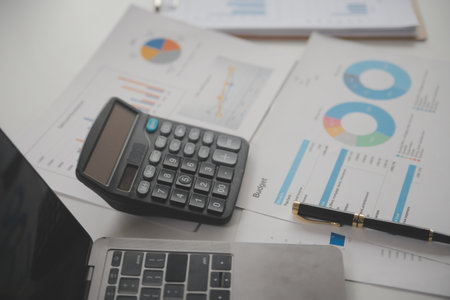Investors working on desk office and using a calculator to calculate balance, projit, currency and cost. Accounting and Financial concept.