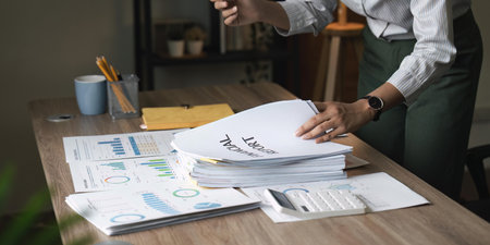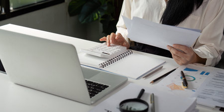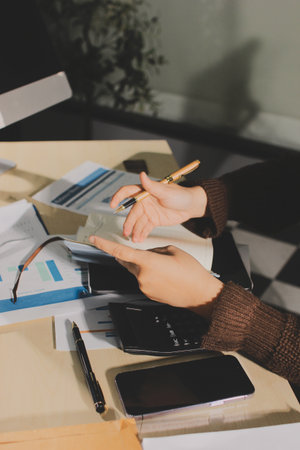 Businesswoman or accountant working Financial investment on calculator, calculate, analyze business and marketing growth on financial document data graph, Accounting, Economic, commercial concept