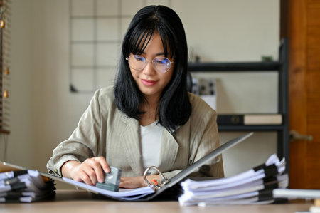 Professional millennial Asian female accountant wearing eyeglasses working at her desk, using a rubber stamp to approve a project and reviewing an accounts report in a folder.