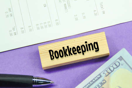 receipts, banknotes and pens with the word bookkeeping