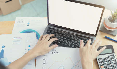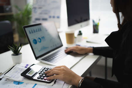 Businesswoman working on laptop computer in the office. Financial accounting concept.