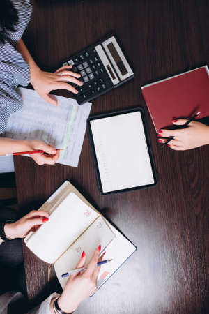 notepad, calculator and employees hands on the table. business concept.