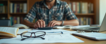 Accountant calculating financial data and preparing reports at a modern office desk.