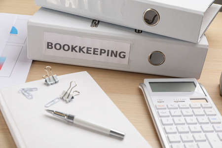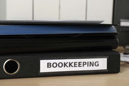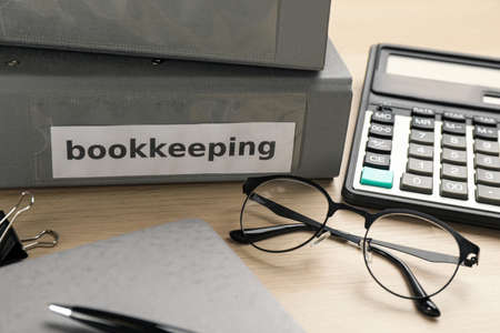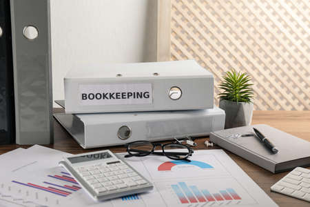 Bookkeeper's workplace with folders and documents on table