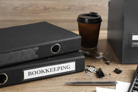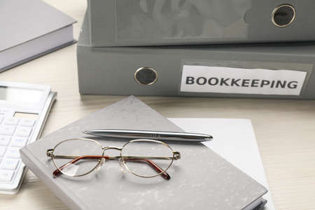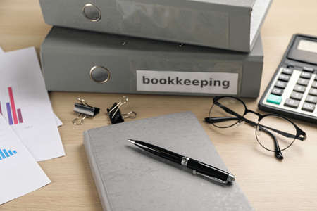 Bookkeeper's workplace with folders, glasses and stationery on wooden table