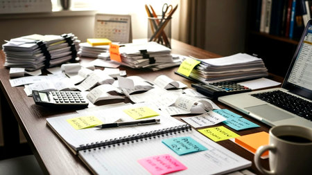 A cluttered workspace with stacks of papers, a laptop, calculators, and sticky notes.