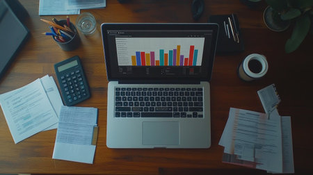 A modern desk setup featuring a laptop displaying colorful charts, surrounded by papers, a calculator, and a cup of coffee, ideal for business analysis.
