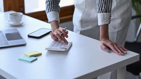 Female accountant standing at office desk and using calculator.