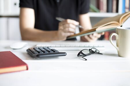 Hand of an Asian employee is calculating numbers on the office workspace.