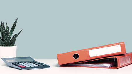 Calculator and orange document binders or lever arch file on an office shelf or desk. Cactus succulent in a pot. Business concept banner. Copy space