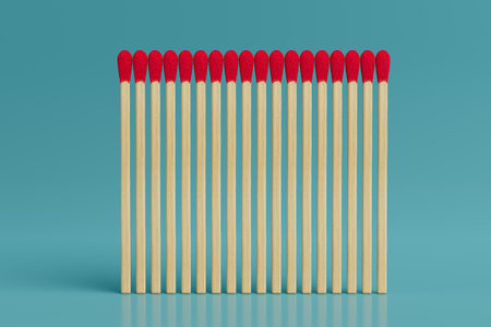 Order And Uniformity Concept. Aligned Red Tipped Wooden Matches Standing In Perfect Row On Blue Background With Clean Symmetry And Soft Reflections. 3d Rendering